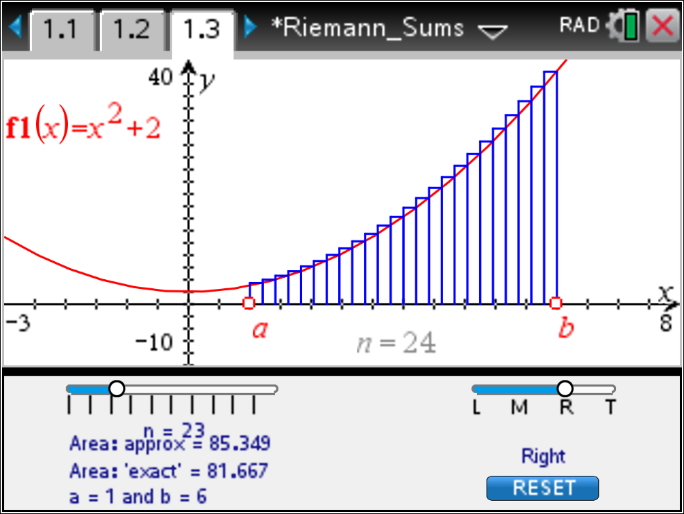 In this activity, your students can quickly learn that for a continuous nonnegative function f, there is one interpretation of the definite integral f(x)dx from a to b, the area of the region R, bounded above by the graph of y = f(x), below by the x-axis, and by the lines x = a and x = b. This is perhaps one of the quickest ways to visualize Riemann sums and students can look at the left hand, right hand, and midpoint Riemann sums easily for many different functions and intervals.