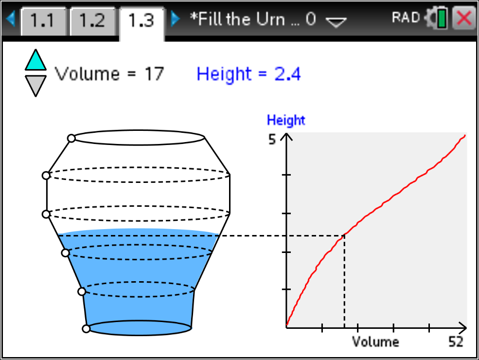 The Filling_the_Urn.tns TI-Nspire document provides for a graphical investigation of related rates. The physical context is the filling of an urn with liquid, depicted in a window on the left side of the illustration. The associated graph represents the height of liquid in the urn as a function of the amount of liquid in the urn. The shape of the urn determines the characteristics of this graph.