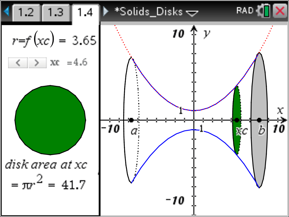 Students often have a difficult time visualizing the solids of revolution and how the volume and the integral are related. This interactive demonstration can help students make connections between the solid generated by revolving the function graph about the x-axis and disks centered on the x-axis, the radius of which correspond to the value of the function at that point.
