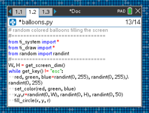 Are you or your students new to Python? For a quick introduction to graphical programming in Python be sure to study the TI Codes materials, especially Unit 5, which briefly introduces some of the unique TI modules: ti_plotlib and ti_draw. Using the drawing functions found in the ti_draw module makes it a breeze to quickly produce custom graphics screens. There is also new material under the Python modules section that deals specifically with the custom ti_* modules. |