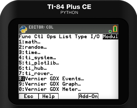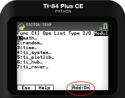 - TI-84 Plus CE Python users: The module will now be available in any Python program that you create under the “Add-On” tab. Simply use the Add-On option whenever you need to import that module’s functionality for your program.