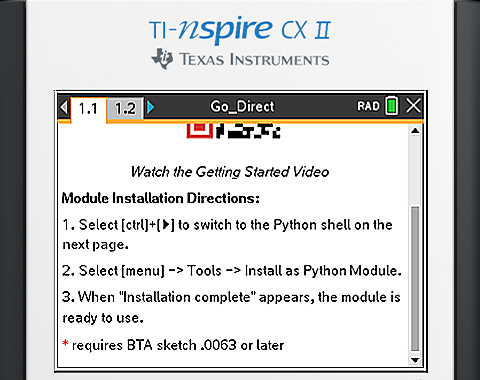 Next, download the module(s) and sample programs to your calculator from education.ti.com/go-direct.- TI-Nspire™ CX II graphing calculator users: Download the file and load it onto your calculator using the TI-Nspire™ CX II Connect web utility.