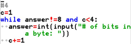 #4. Set the counter to 1. While the answer isn’t 8, and there have been fewer than three guesses, input a guess.