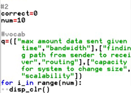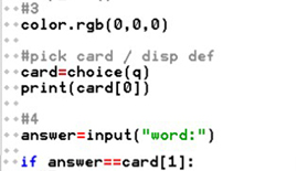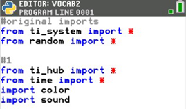 The list for computer systems and networks is rather lengthy. Think about all the review students could accomplish if each student in your class created a flash card stack with a different list of vocabulary. After a few days of practice, partner pairs could link calculators and swap vocabulary lists. Let’s take a look at how the code might look: (Note that #1, #2 and #3 are shown in the code itself as comments. These have been included for instructional purposes to help clarify the purpose of each section of code. These are not essential code elements to include.) #1. First, you need the library imports. #2. Then, question and answer lists.