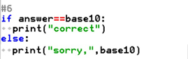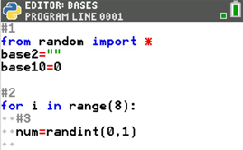 Students could write questions and answers for problems such as “What is the binary equivalent to the base ten number 147?” Again, students could swap (link) with a partner for more practice. Or better yet, write a project. They could code a project to practice converting binary to decimal, or vice versa. #1. Import the random library and declare variables. #2. Loop eight times. #3. Generate either a 0 or a 1.